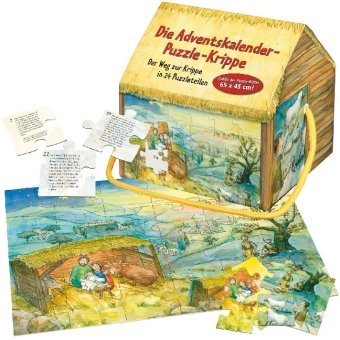 In dieser als Krippenstall gestalteten Box befindet sich ein großformatiges Adventspuzzle mit 24 Teilen, die, täglich als Adventskalender erweitert, einen Weg zur Krippe bilden. Zusammen ergeben die einzelnen Puzzleteile ein von Jutta Höfs wunderschön gemaltes, farbenfrohes Bild zur biblischen Weihnachtsgeschichte, die Stück für Stück auch auf den Rückseiten der Puzzleteile von der bekannten Kinderbuchautorin Brigitte Goßmann kindgerecht erzählt wird.